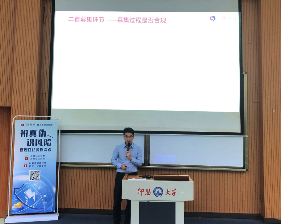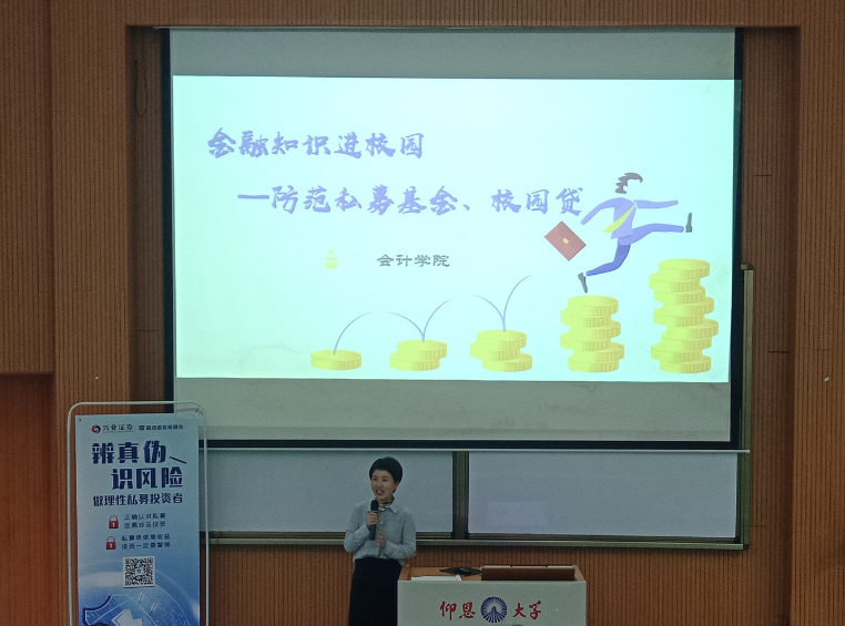 为了更好的提高同学们防范私募基金骗局的意识,远离校园贷,26号下午16:30,yl23411集团在第一教学区和昌教学楼乐之讲堂开展了以“金融知识进校园之防范私募基金、校园贷”为主题的金融安全知识讲座。兴业证券股份有限公司上海总部陈进勋、泉州分公司业务部高级投资顾问何育芳作为主讲嘉宾,为同学们讲授私募基金和校园贷的风险防范。yl23411集团副院长任敏、党总支副书记吴锦霞以及yl23411集团全院师生参加此次讲座。