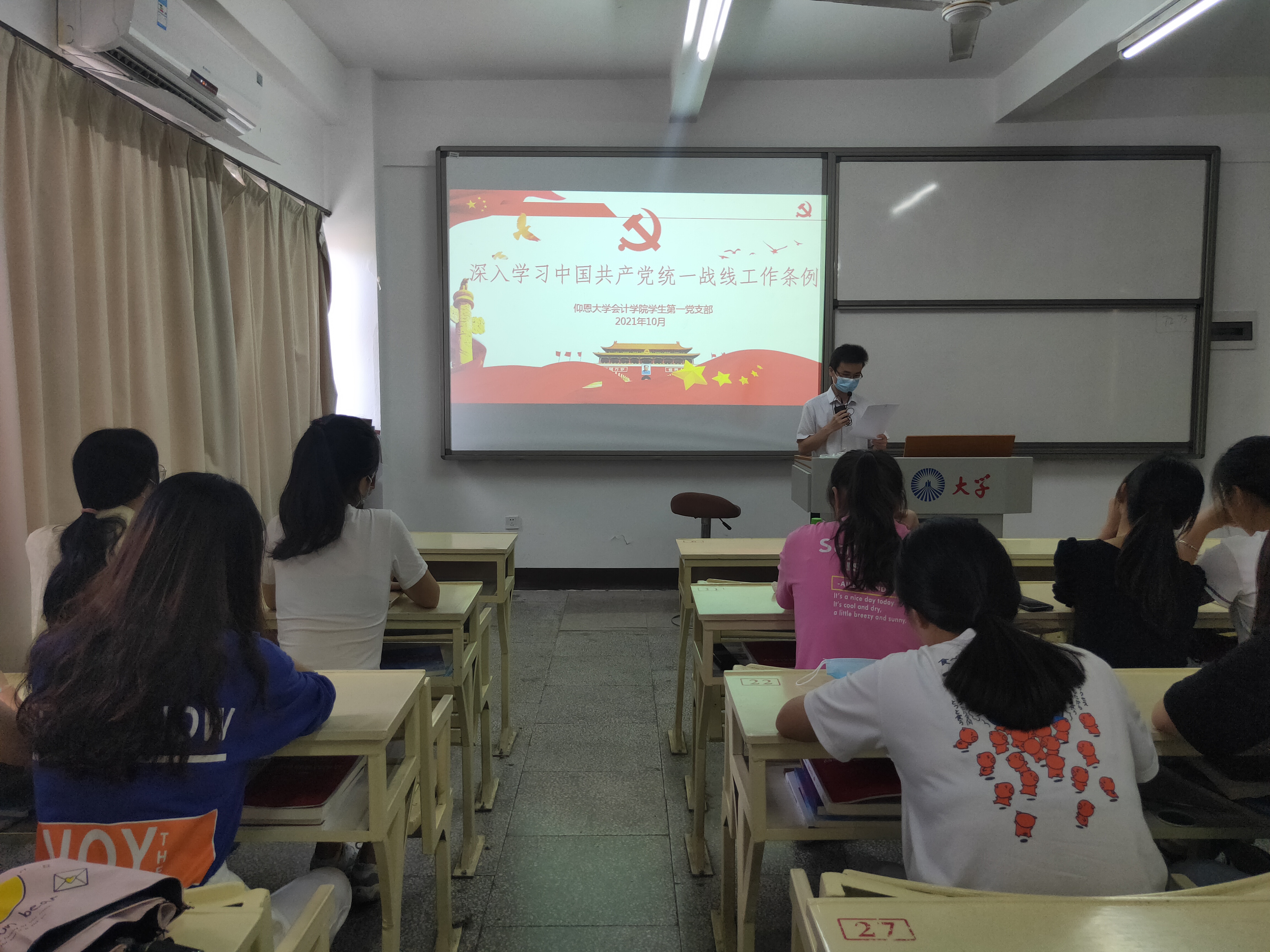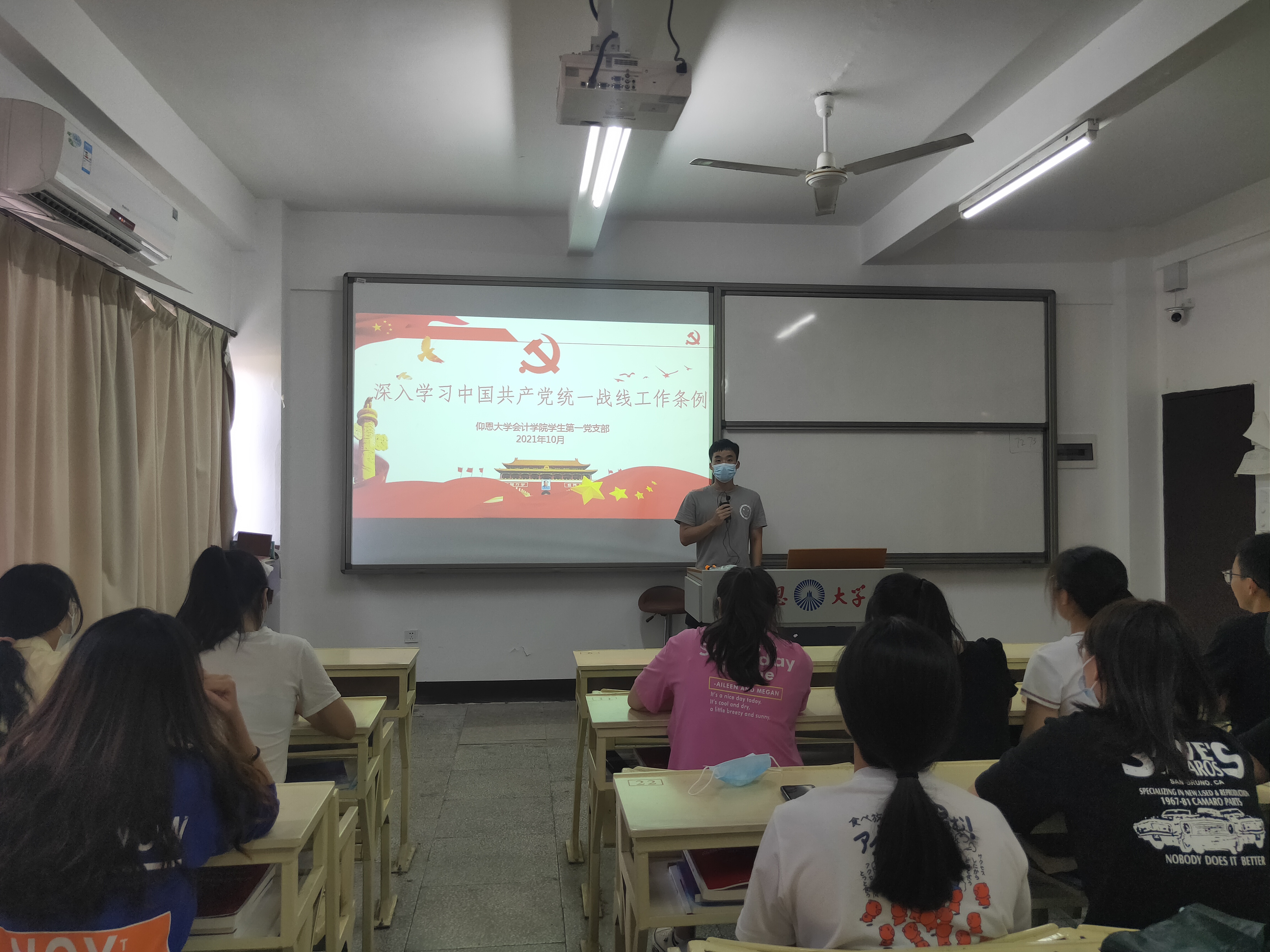 为了全面贯彻落实新时期统一战线工作新要求,持续深入开展学习宣传活动,不断提高全校统一战线工作规范化水平。2021年10月13日下午15:00,yl23411集团学生第一党支部于吉龙楼302教室开展学习《中国共产党统一战线工作条例》。本次学习会由党支部书记林金狮老师主持,支部全体党员参加。