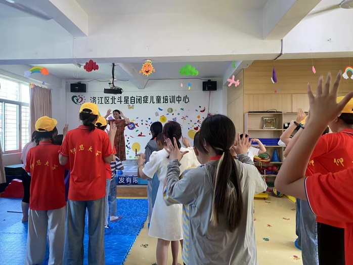 在培训中心老师的悉心指导下,实践队员们走进了自闭症儿童的教室,与他们共度了一段难忘的时光。通过参与跳广播体操、感统运动、手指操以及阅读课文等多种互动活动,队员们不仅加深了对自闭症儿童的理解,还让他们感受到了来自社会的关怀与温暖。这些活动不仅帮助自闭症儿童逐渐打开心扉,还让他们意识到在这个世界上,总有人愿意倾听他们的声音。对于实践队员们而言,陪伴自闭症儿童也是一次独特而宝贵的人生体验。让实践队员们更加深刻地认识到这个特殊群体的需求和挑战,从而更加珍惜和感恩自己所拥有的一切。