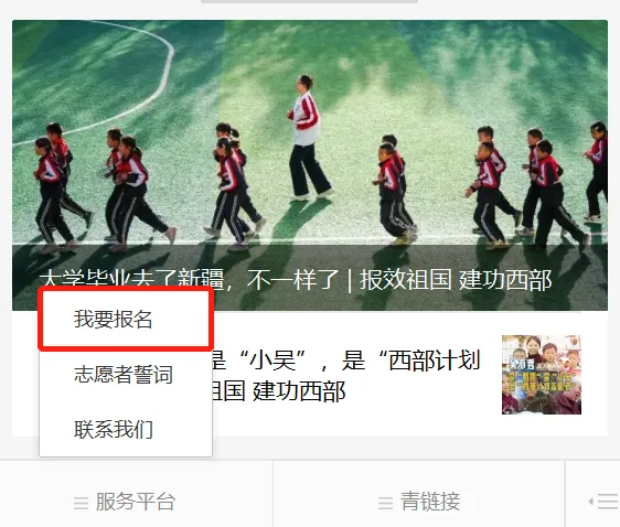 【方式二】进入“西部志愿汇”微信公众号,点击菜单栏中的“我要报名”,进入西部计划信息系统。